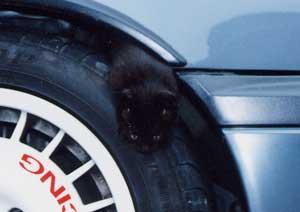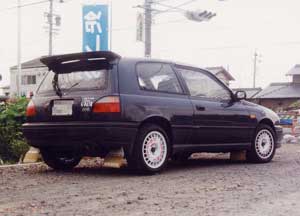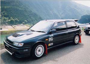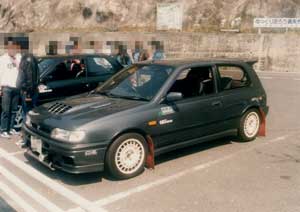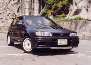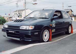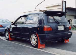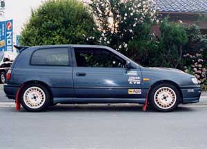 最初はニッサン純正マッドフラップを装着。 タイヤは195/55-14→195/55-15 DL FORMURA RSV と、 OZレーシング ラリーレーシング (7J-15 +35)の組み合わせ。 |